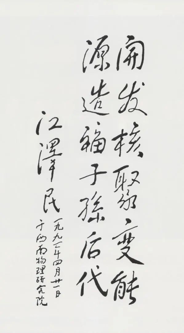 1991年4月21日,江泽民同志视察位于四川乐山的核工业西南物理研究院,题词“开发核聚变能源,造福子孙后代”。