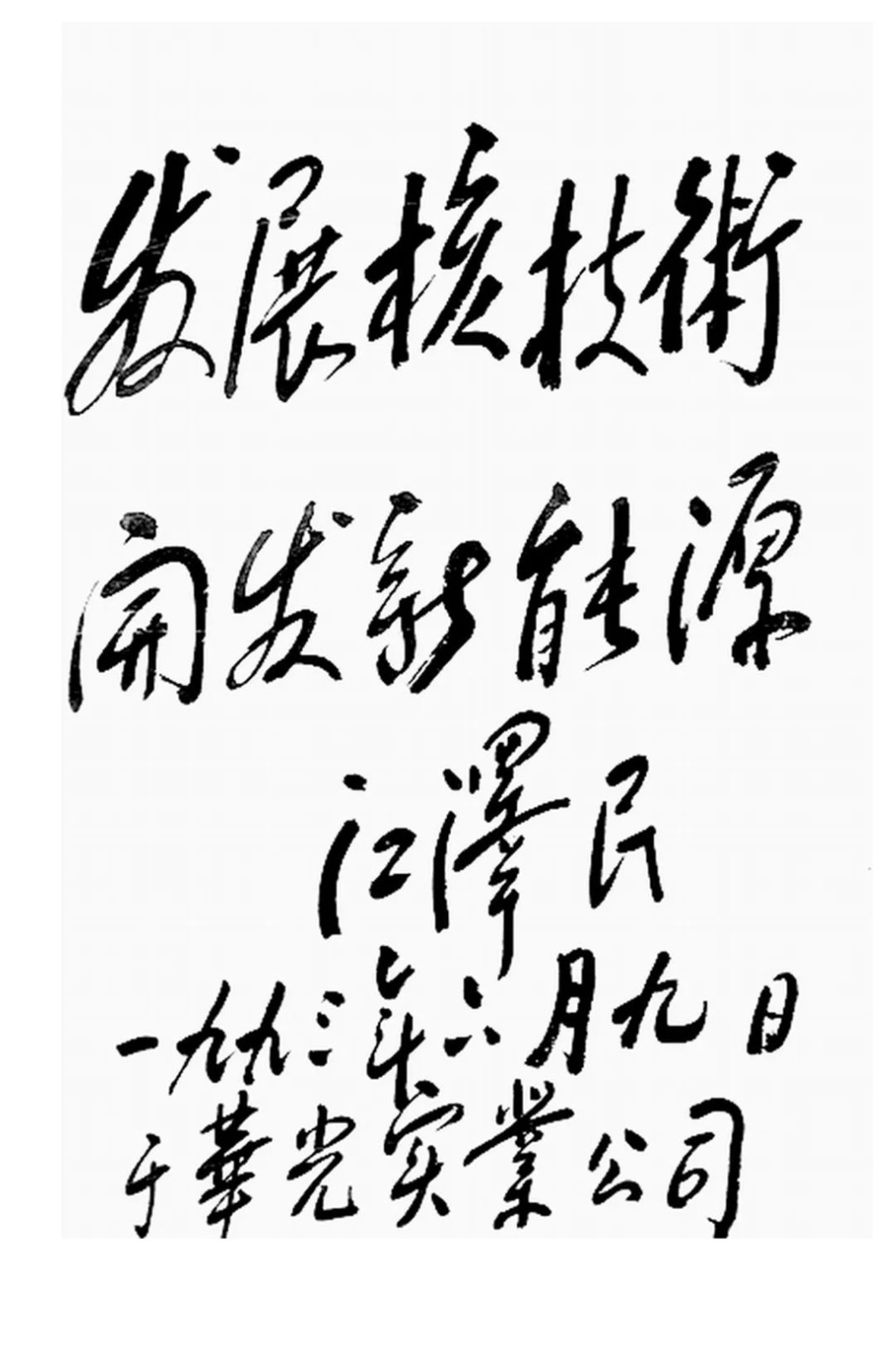 1993年6月9日,江泽民同志到国营四〇五厂(曾用名:华光实业公司)视察并题词“发展核技术,开发新能源”。