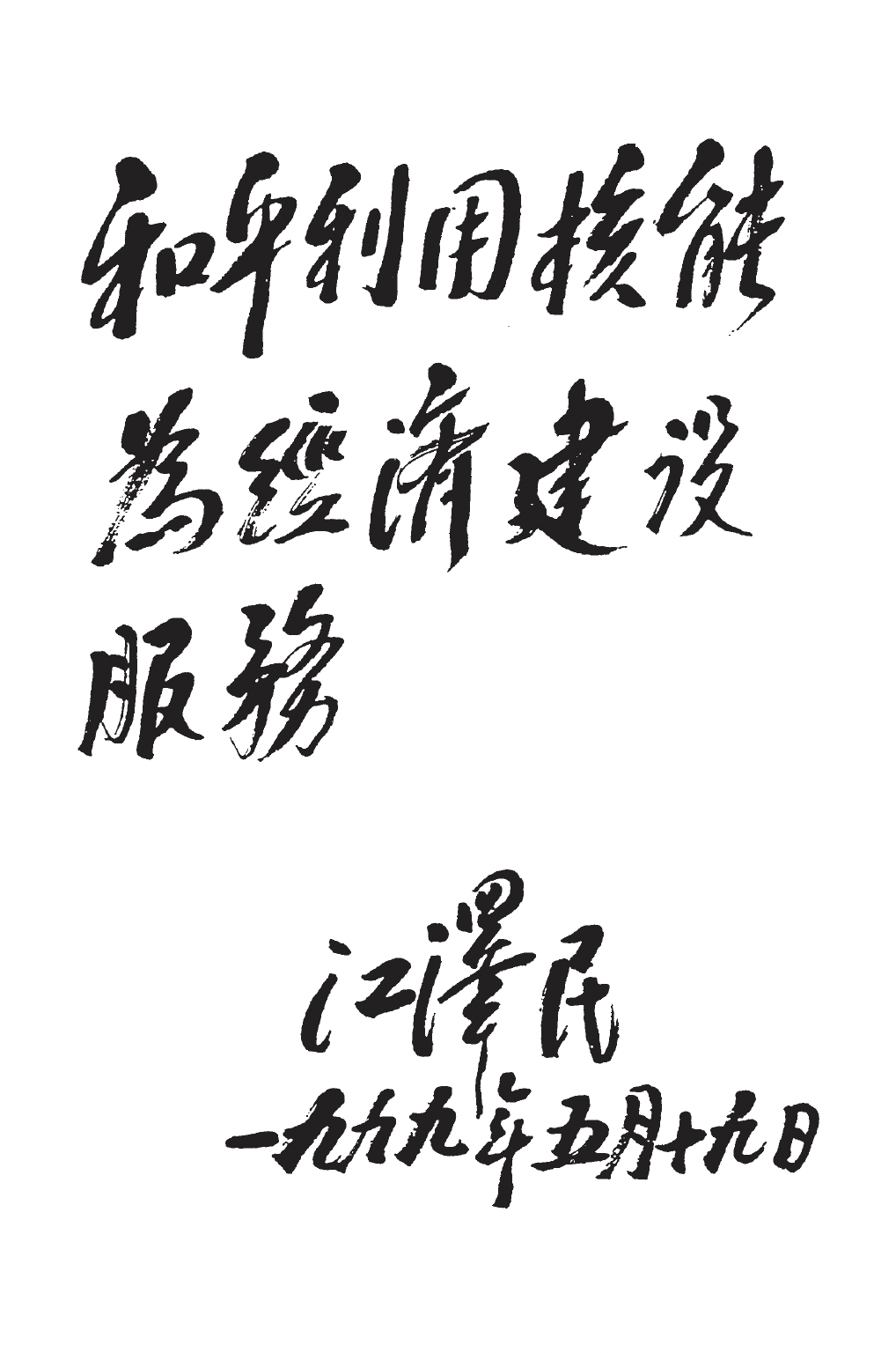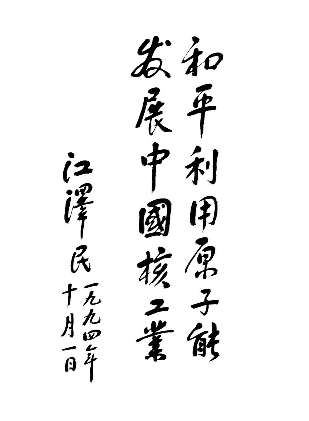 1994年10月1日,江泽民同志为中国核工业创建 40 周年题词“和平利用原子能 发展中国核工业”。