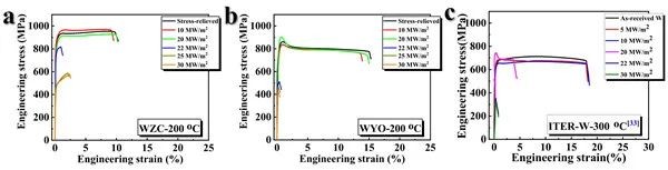 图2. (a) WZC, (b) WYO和(c) ITER-W试样热冲击后的拉伸应力-应变曲线