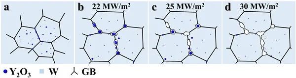 研究团队基于EBMP-30电子束热负荷平台,以两种代表性的弥散强化钨材料W-0.5wt% ZrC(WZC)和W-1.0wt% Y2O3(WYO)为研究对象,在10-30 MW/m2热负荷功率密度(APD)范围内,研究了多次热负荷冲击下材料的损伤行为。当APD ≤ 20 MW/m2时,WZC和WYO试样的微观结构和拉伸性能(图2)相比初始样品均无明显变化。但当APD ≥ 22 MW/m2时,WYO试样发生再结晶和明显的晶粒长大,同时观察到Y2O3颗粒从W基体脱落,WYO的极限抗拉强度(UTS)从861 MPa下降到510 MPa,总延伸率(TE)从15%下降到接近零(图2b)。结果显示,由于Y2O3颗粒与W基体之间的热膨胀系数不匹配,热加载过程中粗大的Y2O3颗粒受热膨胀会挤压W基体,使W基体发生不可逆的塑性变形,冷却后Y2O3颗粒收缩导致Y2O3颗粒与W基体之间形成微裂纹,最终在多次热疲劳作用下粗大的Y2O3颗粒从钨基体脱落,形成孔洞和宏观裂纹(图3)。而WZC由于高的再结晶温度(RCT)(~1300 oC),在22 MW/m2的热加载后,仅发生部分再结晶,仍保持816 MPa高的UTS值(图2a)。此外,由于WZC合金中ZrC的热膨胀系数与W基体相当,且ZrC颗粒尺寸细小、分布均匀,有效避免了ZrC颗粒脱落和微裂纹的形成。