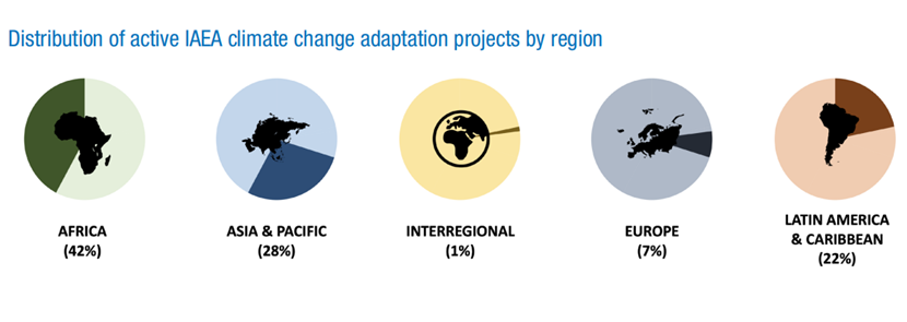 适应气候变化需要进行广泛的结构性、社会性和体制性工作,目的是提升抗灾能力和降低脆弱性。原子能机构的专业知识和经验可在许多领域为全球气候适应作出贡献,包括土地使用和管理、气候智能型农业、粮食生产系统、温室气体排放分析、水资源管理、海岸保护和海洋变化监测等。核技术可作为传统的气候适应和气候科学技术的补充应用于这些领域。原子能机构已为气候变化的原因和影响分析提供一套综合方法,并开展许多国际合作项目,旨在帮助相关国家适应气候变化,其中42%的项目在非洲进行。