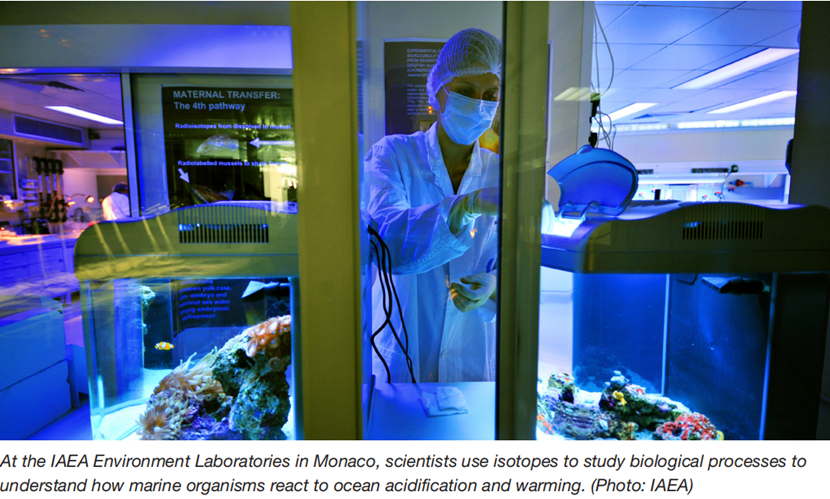 一是海洋生态系统。气候变化使非洲的海洋渔业受到严重威胁。在这方面,原子能机构通过其海洋环境实验室,推进解决有害藻类繁殖、海洋酸化和蓝碳问题的研究和技术合作,并向成员国转让相关核技术。蓝碳是指利用海洋生物吸收大气中的二氧化碳,并将其固定在海洋中的过程、活动和机制。