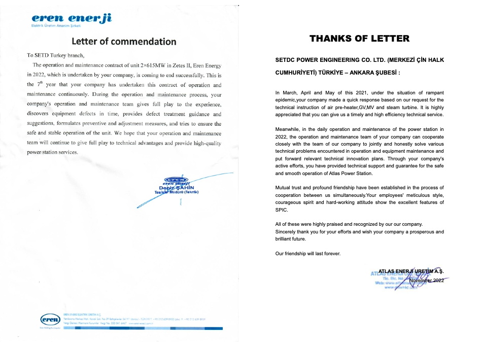 近期,上海能科土耳其分公司相继收到艾伦电厂和阿特拉斯电厂发来的感谢信,对上海能科在2021、2022年度提供的高质量运维、检修、技术指导等电站服务表示感谢和高度赞扬,希望双方在已取得的相互信任和良好合作基础上继续深化合作,实现互利共赢。