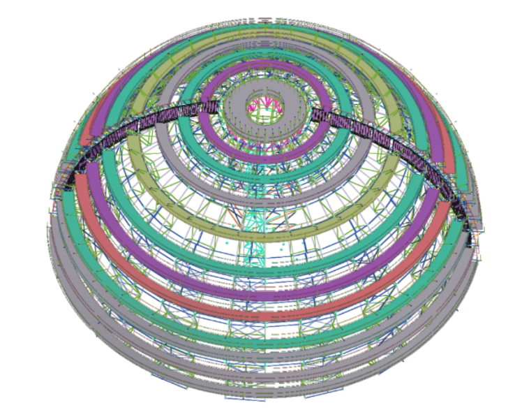 中核二二项目团队牢固树立“一盘棋”思想,贯彻落实中国核建“建安一体化”管理要求,统筹谋划穹顶拼装和内部安装物项施工条件,在保证穹顶单元件拼装尺寸精度控制同时,通过巧妙的曲面空间结构设计,达到了穹顶主体、锚固件、喷淋系统、通风系统等全部件施工需要。