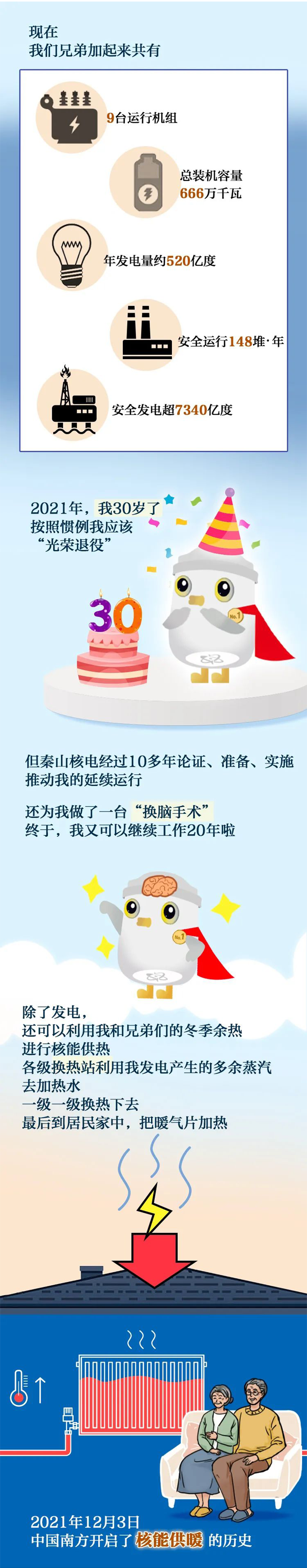 进入新时代,秦山核电在持续发展中做大做强,在保持安全稳定运行的前提下积极探索核能综合利用。2021年,秦山核电与海盐县共同建设浙江海盐核能供热示范工程,开创我国南方核能供热先河,为海盐核能工业供热奠定了良好的工程基础;2022年,秦山核电和海盐县积极开展浙江海盐核能工业供热项目建设,推动减排降耗,助力“双碳”目标。