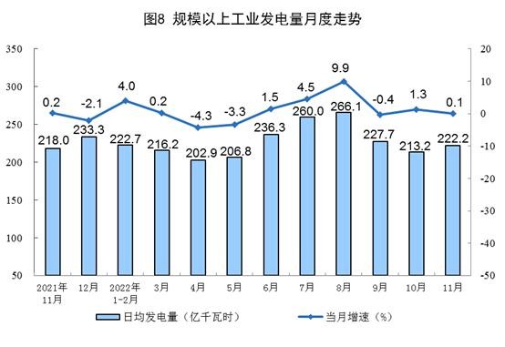 国家统计局表示,11 月份,能源保供稳价政策有力推进,能源先进产能平稳有序释放,规模以上工业原煤、原油、天然气和电力生产同比保持增长。与 10 月份相比,原煤、原油增速加快,天然气、电力增速放缓。
