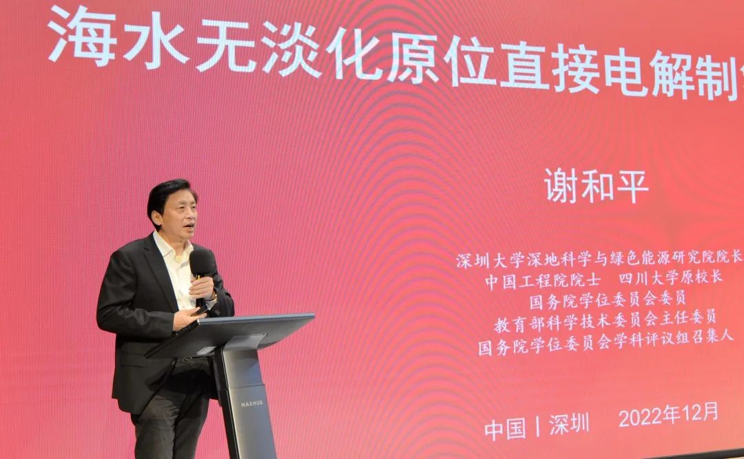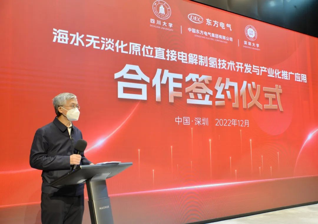 2022年12月16日,东方电气股份有限公司、东方电气(福建)创新研究院有限公司与四川大学/深圳大学谢和平院士团队在深圳签署“海水无淡化原位直接电解制氢原创技术中试和产业化推广应用”的四方合作协议。中国工程院院士谢和平,东方电气集团党组成员、副总经理张彦军,深圳大学副校长汪永成等出席签约仪式。