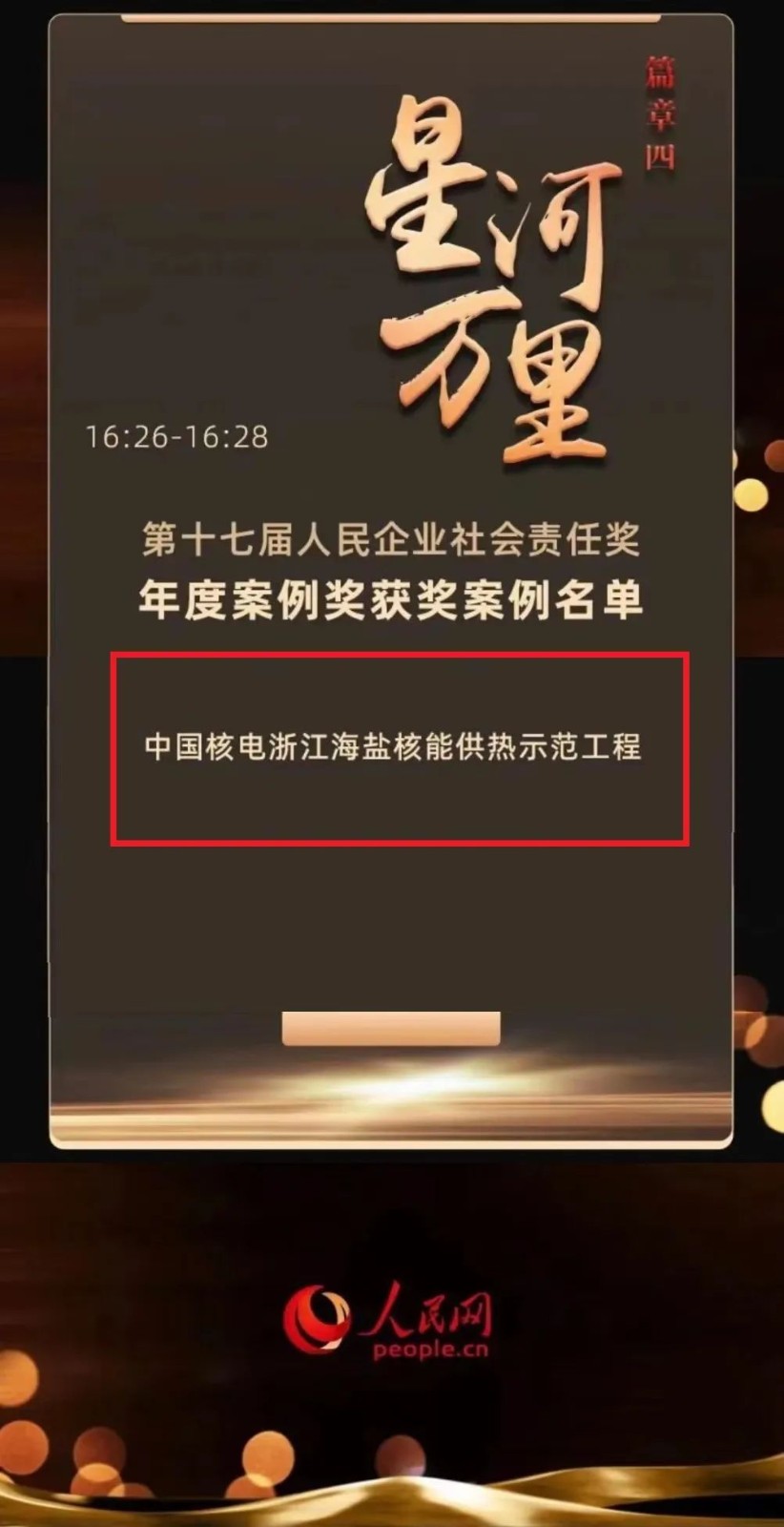 为见证2022年企业在社会责任领域取得的成绩与收获,12月24日,人民网在人民日报社指导下举办“奋进新征程 谱写新篇章——2022人民企业社会责任高峰论坛”。论坛上,中国核电浙江海盐核能供热示范工程获评“第十七届人民企业社会责任奖”年度案例奖。