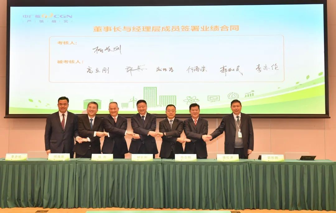 ▲集团公司董事长与经理层成员签署业绩合同会议对2022年为中广核发展付出艰辛努力和作出突出贡献的先进单位及个人进行表彰,为中广核退休员工代表颁发纪念奖章,并签署了集团公司与各成员公司2023年绩效合约。