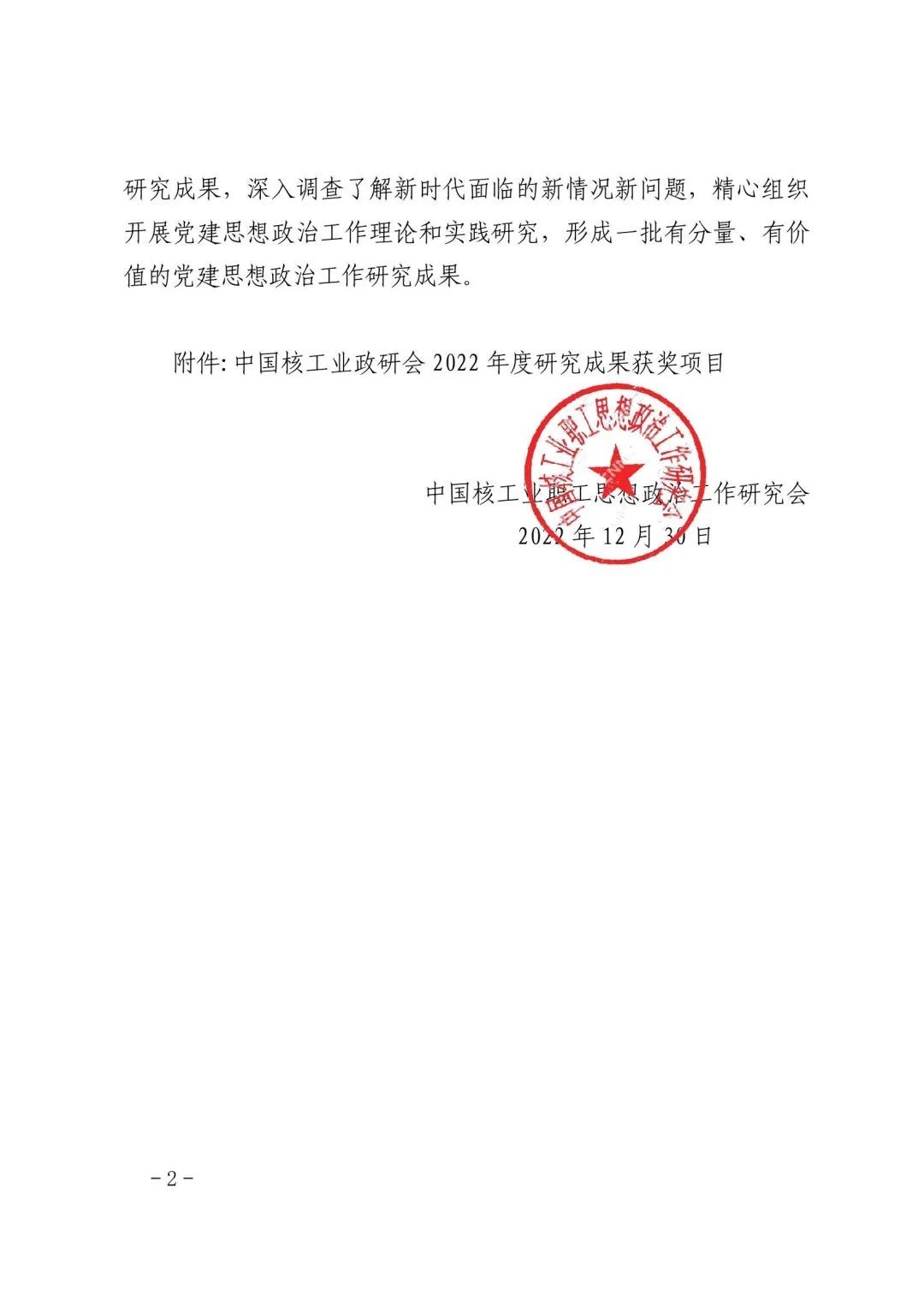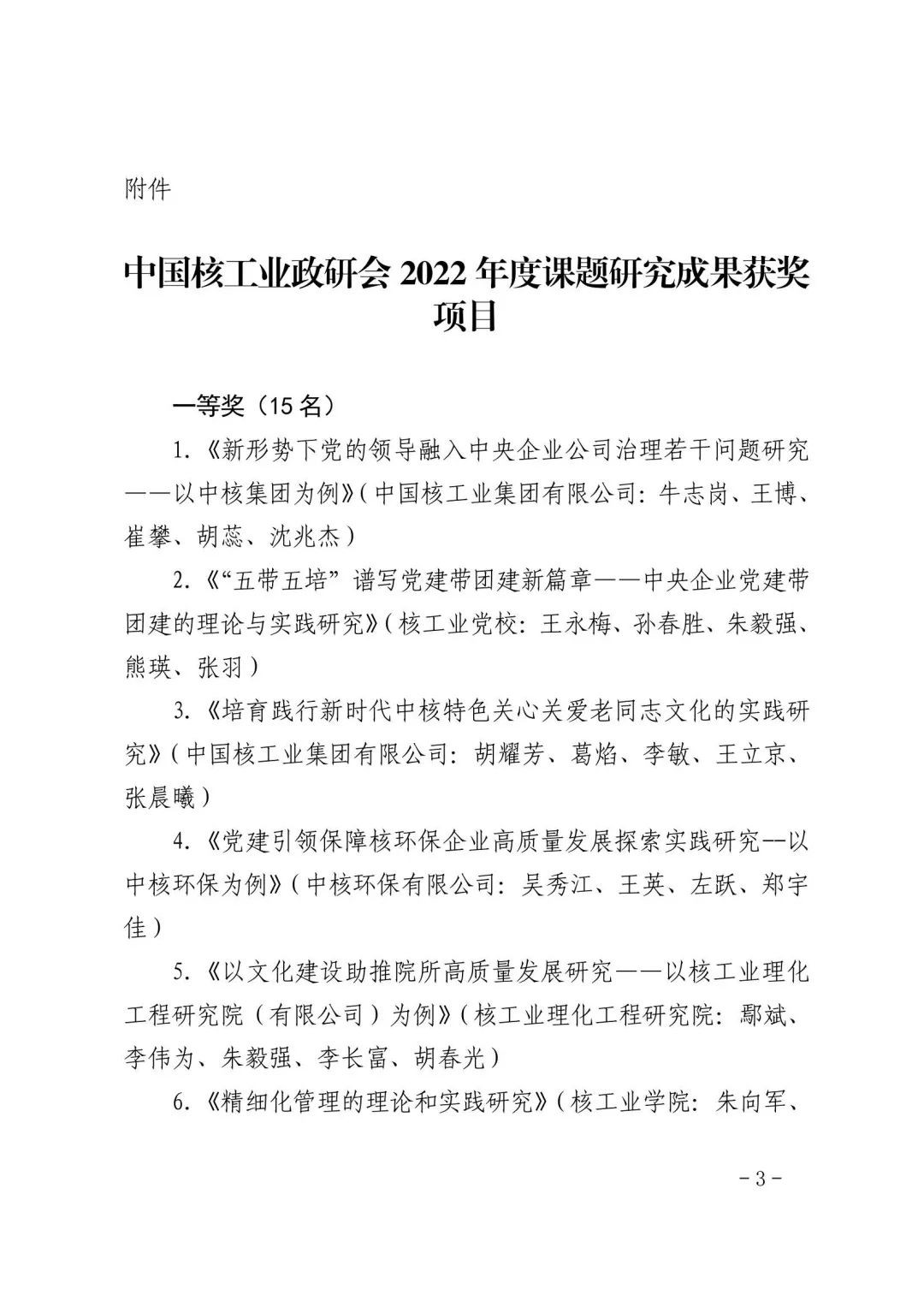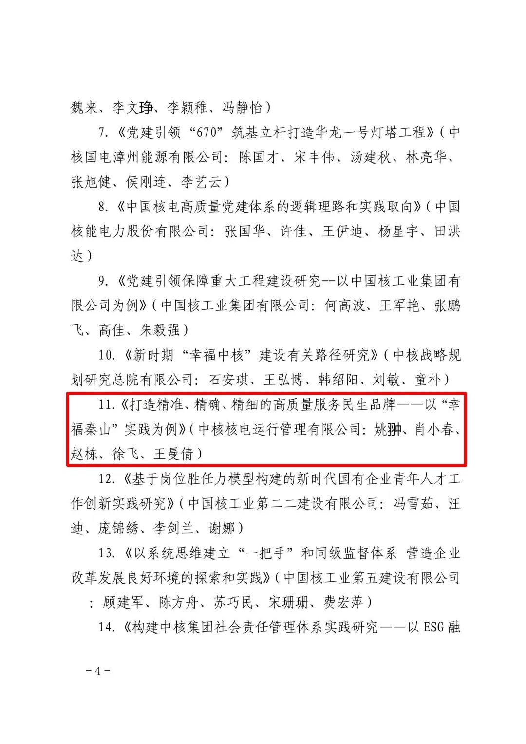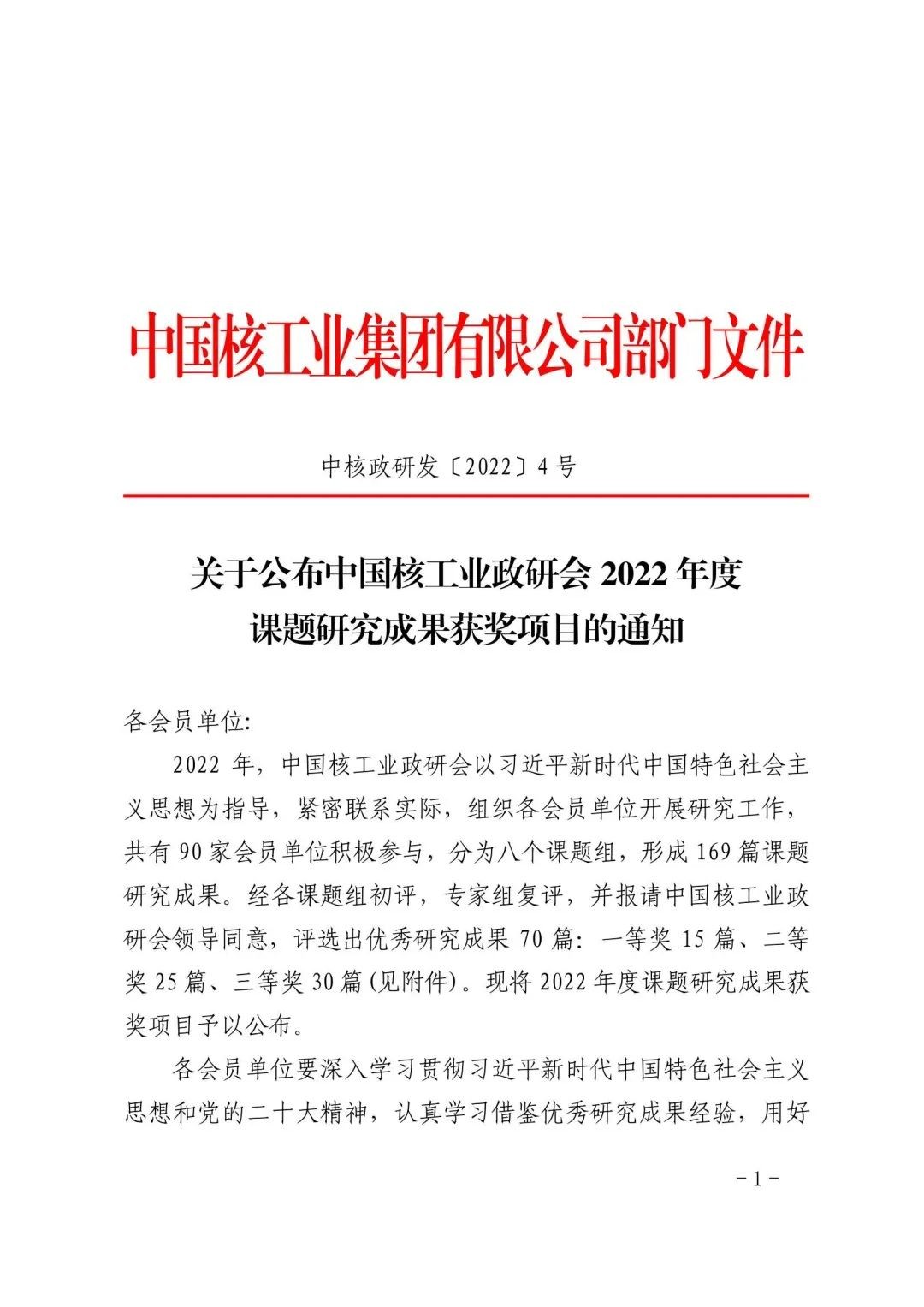日前,中国核工业思想政治工作研究会公布了2022年度课题研究成果获奖项目,秦山核电政研会申报立项的课题《打造精准、精确、精细的高质量服务民生品牌——以“幸福秦山”实践为例》在90家会员单位推荐的169篇课题研究成果中脱颖而出,获课题研究成果一等奖。