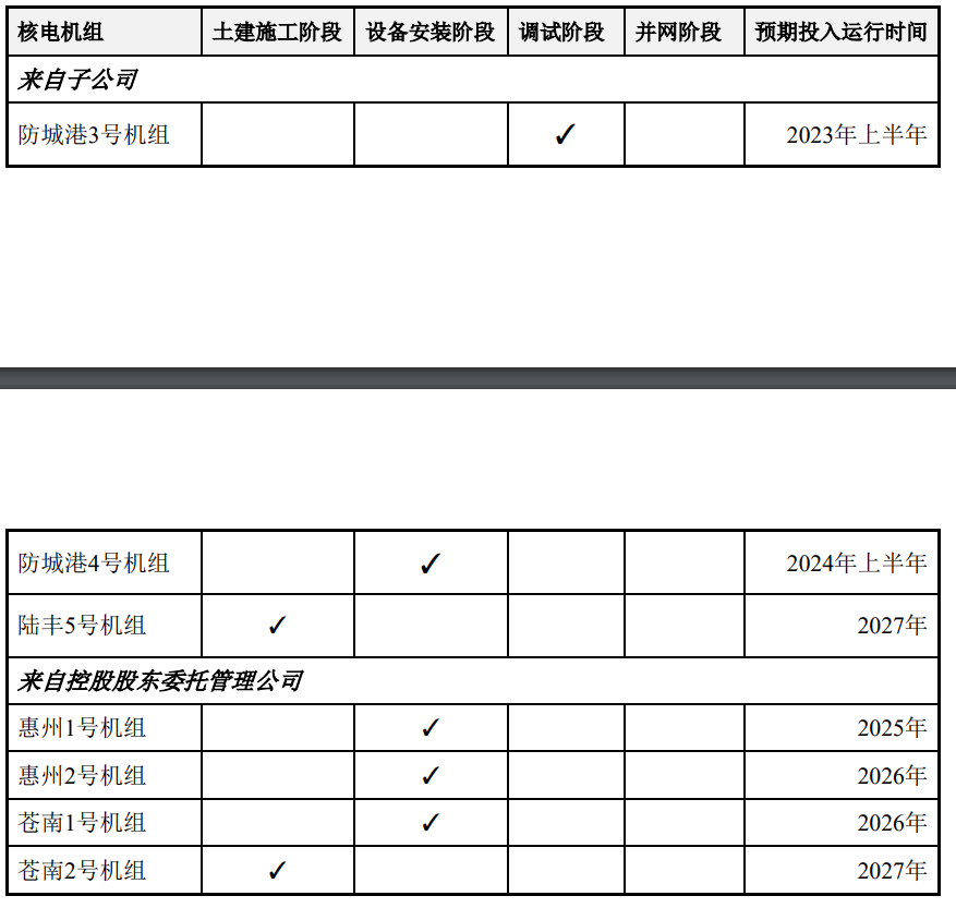 截至2022年12月31日,本集团共管理7台在建核电机组(包括本公司控股股东委托本公司管理的在建核电机组),1台处于调试阶段,4台处于设备安装阶段,2台处于土建施工阶段。在建机组的建设进展详见下表: