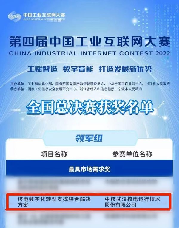 近日,第四届中国工业互联网大赛全国总决赛在宁波举办,中核武汉中国核电工业互联网平台大核源(DHP)项目组“数智核电”团队荣获【领军组】“最具市场需求奖”。