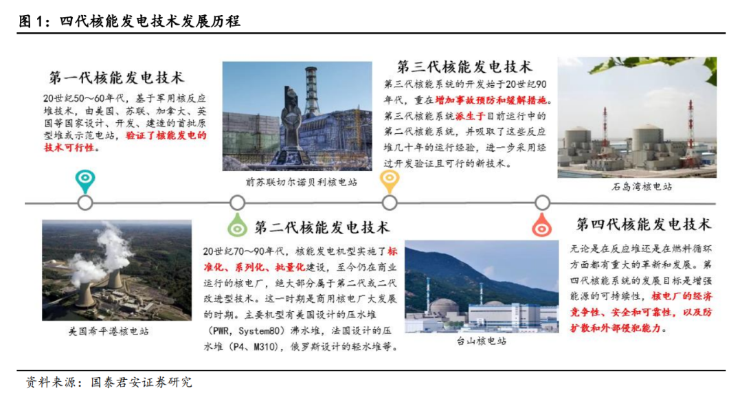 2001年,第四代核能系统国际论坛(GIF)在美国召开,确定第四代核电反应堆堆芯包括高温气冷堆、熔盐堆、超临界水堆、钠冷快堆、铅冷快堆以及气冷快堆等6种堆型。相比前三代核反应堆打补丁式的改进,第四代堆从结构反应、材料应用上都是全新的设计,在原理上实现更高安全性。
