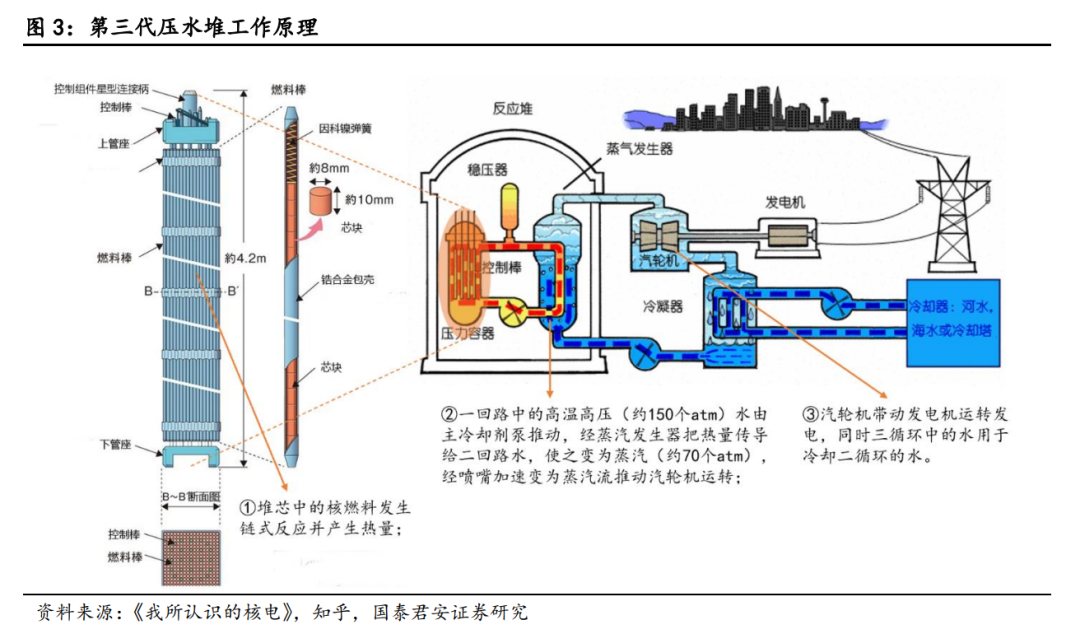 高温气冷堆以氦气作为冷却剂,以石墨作为慢化剂与堆芯结构材料,反应堆堆芯氦气出口温度理论可达950-1000℃,二回路水蒸气出口温度可以达到700℃以上(目前石港湾高温气冷堆实际氦气出口温度为750℃、二回路水蒸气出口温度566℃)。其核反应原理和三代压水堆区别不大,本质上都是将核裂变产生的热能通过冷却剂导出并加以利用变成电能等其他能源形式,但是在燃料球设计、冷却剂以及慢化剂等核心材料上做了优化,从而实现固有安全性和高温两大突出特点。