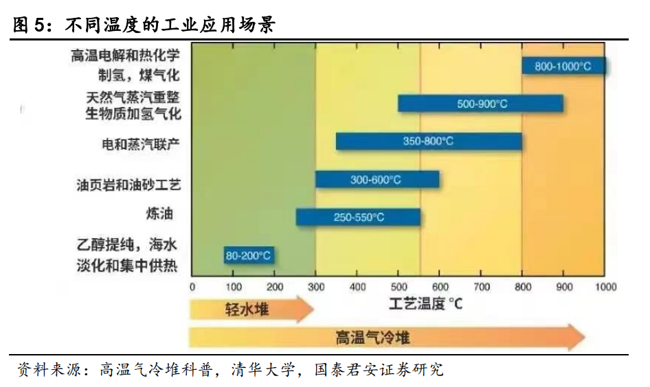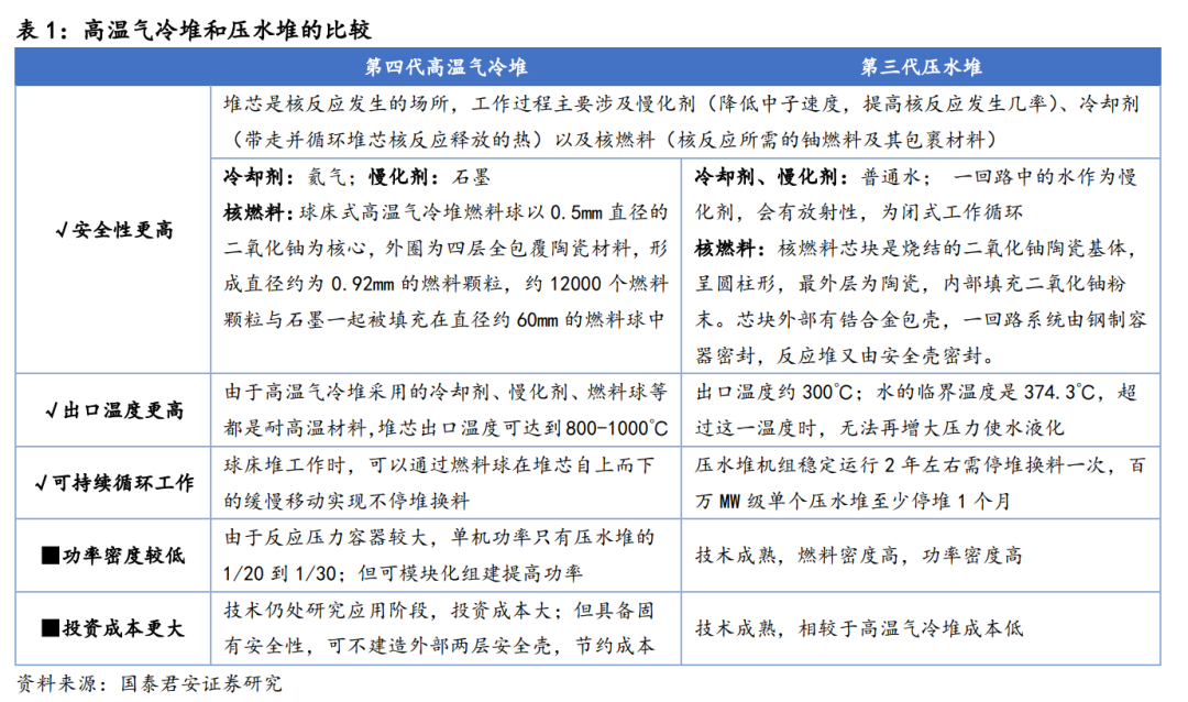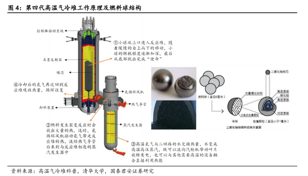 高温气冷堆属于第四代核反应堆,以氦气作冷却剂,以石墨作慢化剂核堆芯结构材料,反应堆堆芯氦气出口温度理论可达1000℃。高温气冷堆具备两大特性:①固有安全性,指不依靠人为干预、仅仅利用自然规律使反应堆自动冷却的安全特性;与目前主流的压水堆不同的是,高温气冷堆用氦气代替水作冷却剂,用石墨代替水作慢化剂,用陶瓷包覆着的燃料球代替原先的燃料棒,三者在高温下优异的稳定性使得高温气冷堆在物理原理上实现了绝对安全。②高温,相较于压水堆约300℃的出口温度,高温气冷堆800-1000℃的出口温度可适用于制氢、热电联产、化工、冶金等需要高温热源的领域。