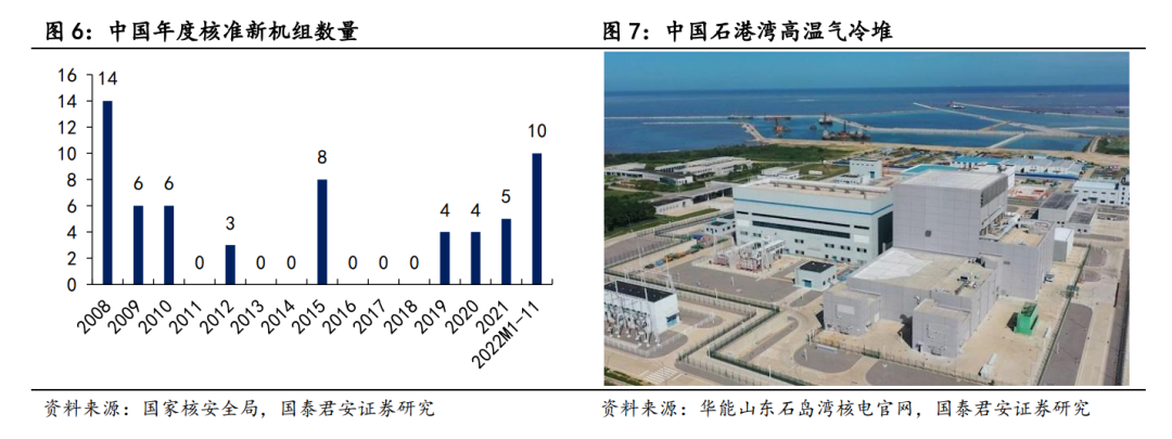 截至2021年底,我国大陆地区共有23座核电站,在建和运行核电机组71台(在运行机组52台),全部分布在沿海地区。由于2011年福岛核电站事故影响,国内对核电站建设一度相当谨慎,自2019年后开始有回升,2022年1-9月,已核准新机组达10台(均为第三代压水堆)。全球已正式投入运行的高温气冷堆仅有两座,分别位于中国山东省荣成市、日本茨城县大洗町。