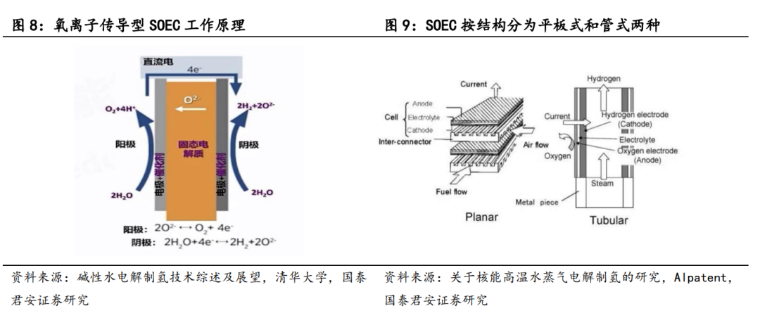 SOEC为全固态结构,由阴极、阳极和电解质组成,从技术原理可分为氧离子传导型SOEC和质子传导型SOEC,从结构类型可分为平板式和管式。以目前常用的氧离子传导型平板式SOEC为例,700-1000℃的水蒸气和循环氢气从阴极进入系统,在阴极发生还原反应产生氢气,同时生成的氧负离子会经由固体电解质迁移到阳极,失电子结合生成氧气。