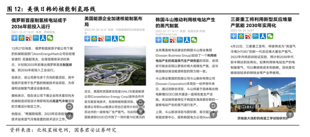 美俄日韩等核电大国均已启动本国的核能制氢工程:①俄罗斯计划在2033年前推出俄罗斯首座制氢核站,2036年前投入工业运行,进行高温气冷堆核能制氢。②美国采取“碘硫循环+SOEC”的制氢路线,在目前的实验室高温模拟环境下,已经能够通过加入催化剂降低碘硫循环核心步骤“硫酸分解”反应所需高温;SOEC路线计划与现有的三代核电堆匹配推进商业化进程。③韩国斗山集团在2022年1月,启动压水堆高温蒸汽匹配“SOEC”制氢项目。④日本三菱重工宣布在2022年内启动高温气冷堆匹配“碘硫循环+SOEC”制氢的验证实验,计划2030年-2035年达到实用化。