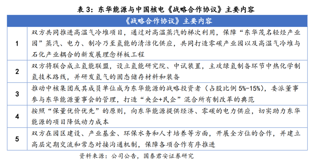 2022年9月,东华能源公告与中国核电签署《战略合作协议》,双方共同推进高温气冷堆项目,未来五年内预计投资超千亿元,共同打造零碳产业园。2022年11月,东华能源公告拟与中国核电共同出资设立茂名绿能,分别持股49%和51%,进一步推进高温气冷堆项目。