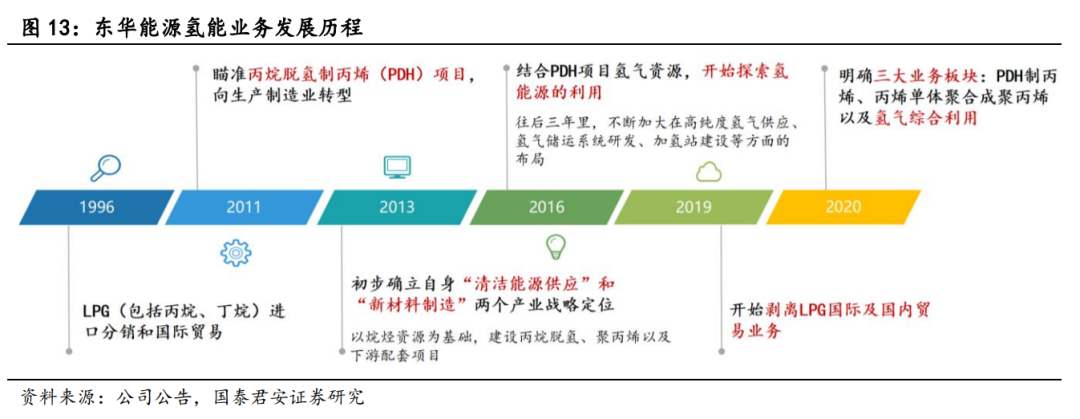 东华能源从LPG(液化石油气,主要组分包括丙烷、丁烷)贸易起家,2011年开始向丙烷脱氢制丙烯(PDH)转型,并逐步确立起聚丙烯高端复合新材料和氢能源两大战略发展方向。在氢能源方面,公司拥有宁波、茂名、张家港三个生产基地,现有副产氢产能8.6万吨(宁波5.7万吨、张家港2.9万吨),2021年副产氢销量1.872万吨,实现利润2.14亿元。公司目前规划建设茂名基地两套60万吨PDH装置,若全部投产,预计副产氢产能将达到14.3万吨。