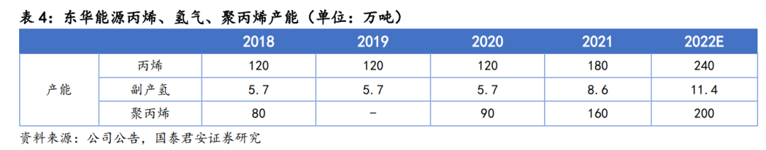 在氢能源方面,东华能源目前拥有丙烷脱氢副产氢产能8.6万吨,2021年副产氢销量1.87万吨,实现利润2.14亿元。高温气冷堆项目预计将于2023年开工建设,建设期4年,2027 年正式投入使用。项目建成后,高温气冷堆提供的热源:一方面可用于丙烷脱氢工艺(PDH需要在550-650℃的高温下进行),降低脱氢成本;另一方面,可用于匹配SOEC或碘硫循环制氢路线,实现大规模工业制绿氢。