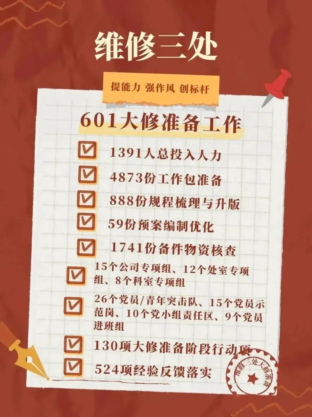 运行三处未雨绸缪,认真研究部署601大修前期筹备工作,从内、外部双管齐下,召开多次大修工作准备会,统筹安排大修安全、人员、技术、后勤等工作部署。开展“我为大修做贡献”601大修准备竞赛活动以及“无9位码”现场定位演练,通过提前熟悉大修文件包,实现无延时精确定位设备。充分识别防范化解各种潜在风险,在大修常规管控流程的基础上,建立一系列补充管控措施,编制大修风险化解技术导则,制定现场工作“叮嘱卡”等,提高大修团队设备定位能力和防人因失误水平。