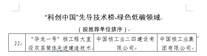 近日,中国科学技术协会2022年“科创中国”系列榜单遴选结果公布,中核二四申报的“华龙一号核工程大直径双层筒体先进建造技术”项目,入选2022年“科创中国”先导技术榜(绿色低碳领域),成为全国该领域榜单25个上榜项目之一。