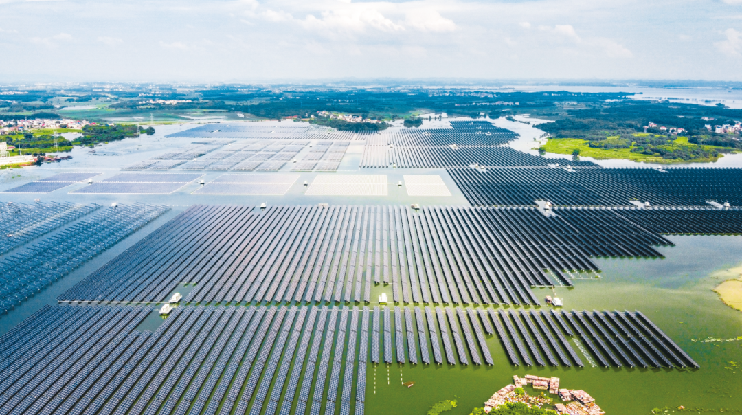 ▲中国华能麻叶湖光伏电站实现了渔光互补光伏发电项目与鄱阳湖周边水域的完美融合。华能集团/供图