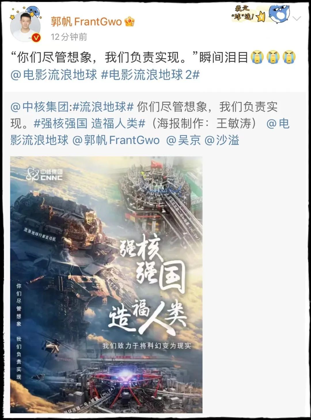 近日,中核集团发布一张海报,画中赫然显现电影《流浪地球2》中的行星发动机,并排的是中核集团的核聚变实验装置:中国环流器二号,文案写着“你们尽管想象,我们负责实现。”海报被网友誉为“最硬核的梦幻联动”,同时引发史无前例的“央企朋友圈评论”。中国航天科工微博留言“这事咱不得一起吗”;中国船舶留言“你就说我干点啥吧”;中国联通表示“我负责通信”;中国石化声称“我负责能源”……这恐怕是电影上映之初未设想到的溢出效应——一部电影能吸引如此多“行业客户”。