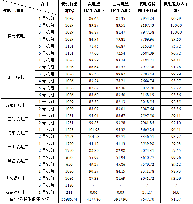 4)本表“合计值/整体值/平均值”中,装机容量、发电量、上网电量为各机组合计值,核电设备利用小时数为全部机组整体值,机组能力因子为全部参与统计的机组的算数平均值。