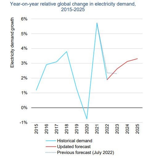 IEA预计,全球电力需求在2023年的增幅预计为2.6%,同时在2024和2024年增幅约为3.2%,比新冠疫情前几年的平均增速2.4%有所提高。