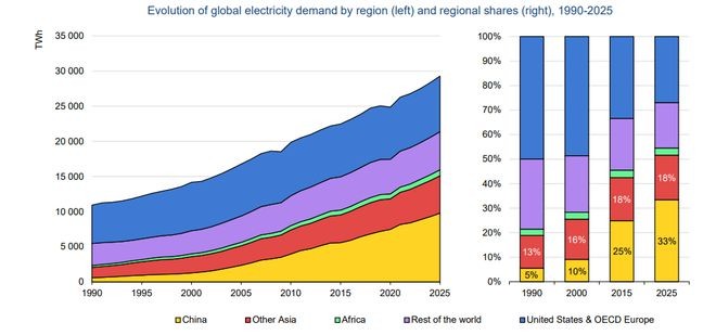 亚洲将在全球电力需求增长中占主导地位。IEA预计,中国、印度和东南亚的电力需求增幅,将占全球总增幅的70%以上。其中,预计中国占全球电力需求的比重将从2015年的四分之一提高到2025年的三分之一。