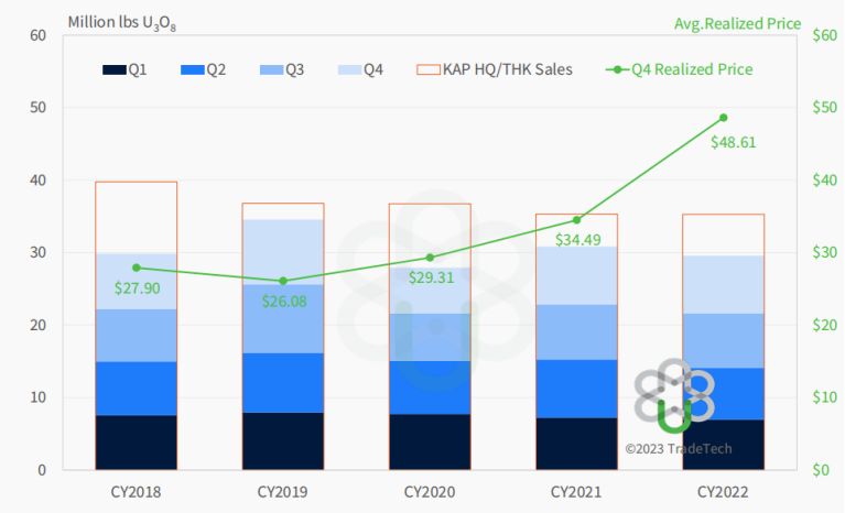 哈原工的销量在2022年保持稳定,为13,542吨铀(3,520万磅U3O8),平均销售价格为42.51美元/磅U3O8,相比2021年增长31%。第四季度销售总量为1,340吨铀(350万磅U3O8),平均销售价格为48.61美元/磅U3O8。