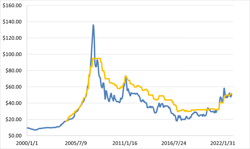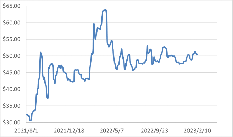 2020年1月-2023年1月末现货铀价和长贸铀价