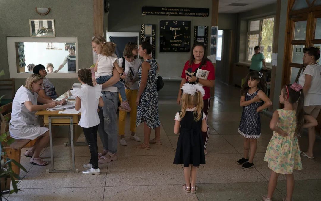 当地时间2022年9月2日,乌克兰扎波罗热,人们在当地一所学校领取碘片,预防核泄漏带来的危害。