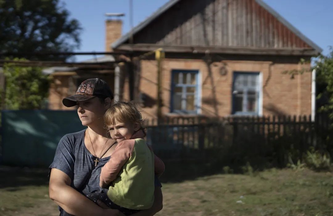 当地时间2022年9月2日,乌克兰Zorya,娜塔莉亚·斯托科兹抱着她3岁的女儿维罗妮卡站在房子前。Zorya村距离扎波罗热核电站大约20公里。斯托科兹是三个孩子的单身母亲,她说,“炸弹并不可怕……但是发电厂是最可怕的。”