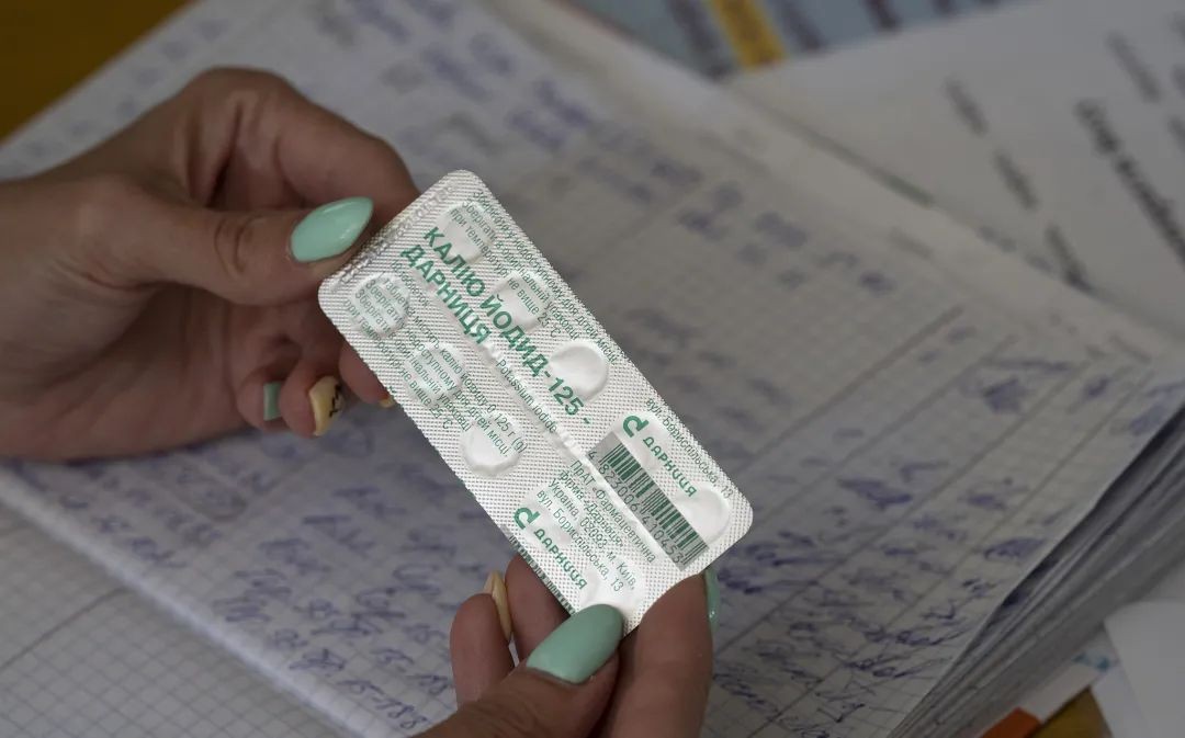 当地时间2022年9月2日,乌克兰扎波罗热,一名妇女给居民分发碘片。