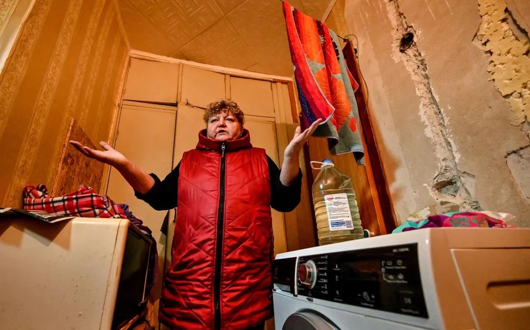 当地时间2022年11月2日,扎波罗热地区,当地居民Olha Ivanivna展示了她如何在没有集中供水的情况下使用洗衣机,因为靠近前线的城市定居点已经8个月没有供水了。