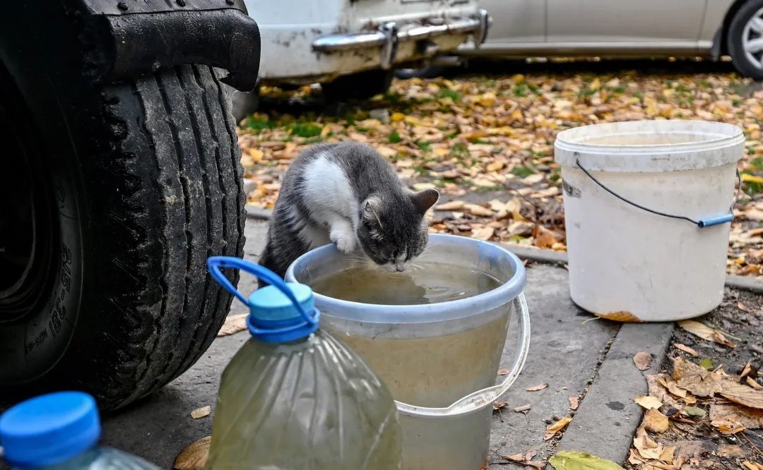 当地时间2022年11月2日,扎波罗热,一只猫正在喝由农民送到当地居民手中的水桶里的水。