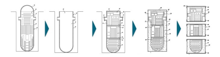 现在空的反应堆容器在水下被重新包装,根据每个部件的特性,使用精确设计的高污染和活性废物的位置。这将最高废物类别的部件集中在垂直容器的中间,而活性较低的废物则被放置在底部和顶部部分。然后将反应堆容器和重新包装的内部构件排空并固定在专门为实现ALARA(尽可能低的合理实现)目标而准备的灌浆中,并将反应堆内部构件固定在容器内。