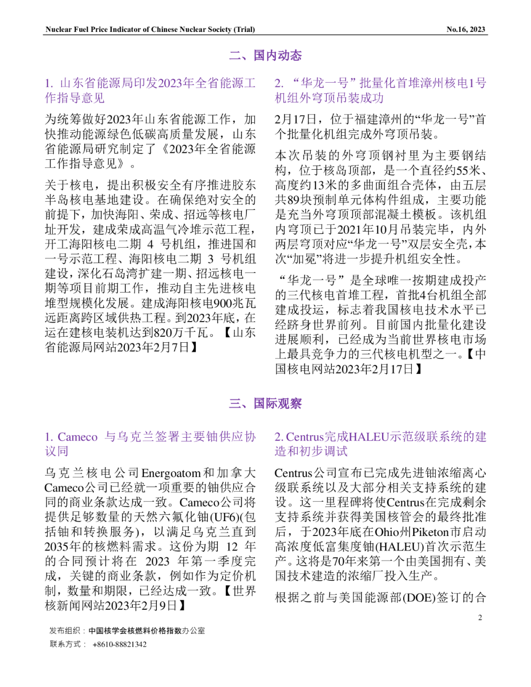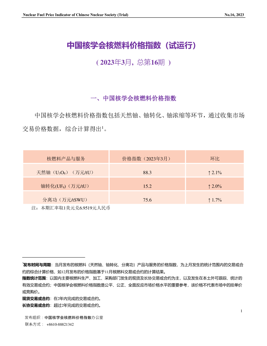 中国核学会核燃料价格指数(试运行) ( 2023年3月, 总第16期 )