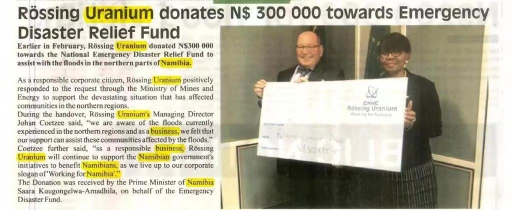 2023年1月下旬,纳米比亚北部地区短时间内连降大雨,形成洪涝灾害,大量房屋和校舍受到影响,给当地居民的生产生活造成巨大困难。矿长约翰在捐赠仪式上表示,我们看到了北部受灾的照片和报道,作为一个负责任的企业,我们不能坐视不管,希望本次捐赠能够帮助当地的受灾群众重建家园,正如罗辛的口号“为纳米比亚工作”“Work for Namibia”,罗辛也将一如既往响应政府号召,为纳米比亚作出更多贡献。