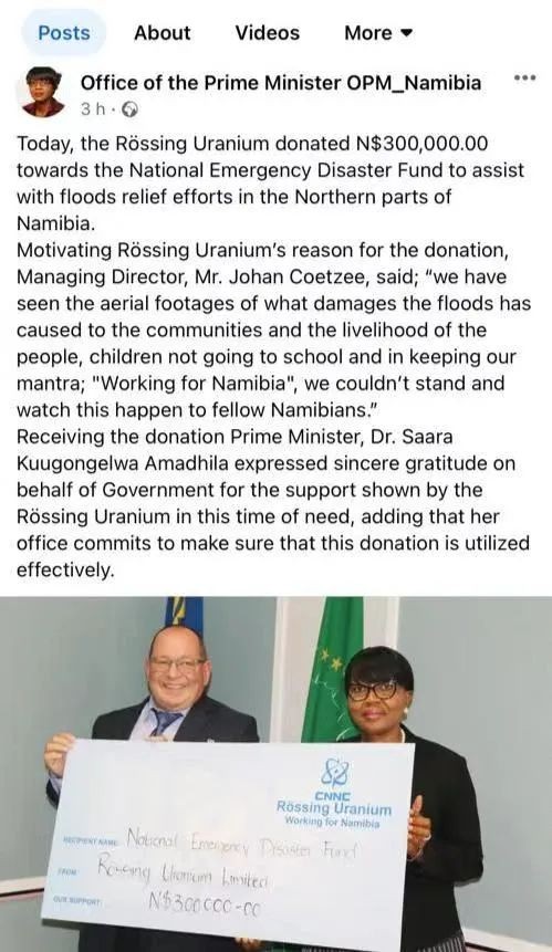 近日,中核集团罗辛铀矿向纳米比亚救灾基金捐资30万纳币,用于帮助纳米比亚北部因洪涝灾害生产生活受影响民众重建家园。罗辛铀矿矿长约翰·柯兹(Johan Coetzee)代表中核集团向纳米比亚救灾基金进行捐赠,纳米比亚总理沙拉·库贡戈勒瓦(Saara Kuugongelwa)代表总理府接受了捐赠。