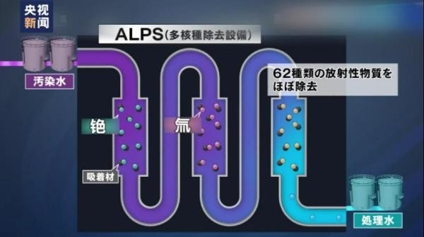 △“多核素去除设备”(alps)工作原理工作人员介绍说,这些核污染水被抽取后,会被输送到“多核素去除设备”(alps)中,大部分放射性物质通过化学品沉淀处理和活性炭等吸附材料进行去除。东电将这种经过处理的水称为处理水,其中含有多核素去除设备无法分离和去除的氚元素。目前厂区内1000多个存储罐中经过处理的污染水不到40%,超过60%的污染水仍处于待处理状态。