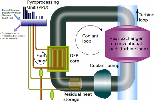 Dual Fluid紧凑型反应堆设计有两个回路:一个燃料回路和一个冷却剂回路。该反应堆使用的液体燃料包含钍、天然铀和经过处理的核废料,并采用液态铅作为冷却剂,设计换料周期为25年,可用于发电、供热和制氢。Dual Fluid设想开发两种规格的反应堆,分别是DF300(装机容量300 MWe)和DF1500(装机容量1500 MWe)。