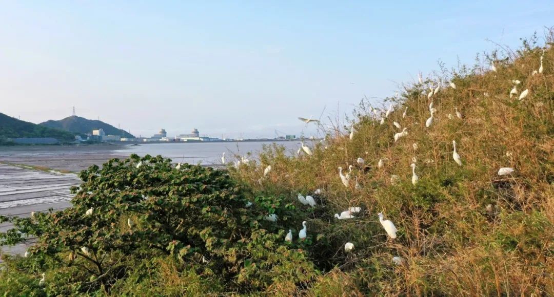 三门核电附近有座小岛,名为青山岛,成群的鹭鸟相约来到此地,让这座小岛成了名副其实的“鸟岛”。核电厂与之为邻已十余载,“鹭丁兴旺”见证了三门生态之佳。三门核电摄影爱好者侯邦军是这里的“常客”,据他介绍,这里的鸟儿数量多,又不怕人,不仅成为摄影爱好者的至爱,更是核电作为清洁能源尊重自然、融入自然的有力见证。