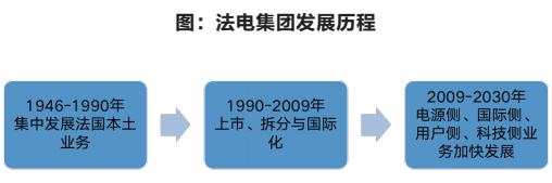 20世纪40年代,为了战后重建,法国政府对电力行业实施国有化,组建了法电。1946年,法国将1450家私营的发、输、配电公司及燃气公司国有化,组建成法国电力公司。在法国电力工业发展初期,法电受政府要求集中力量开展水电、火电、核电、输电建设,迅速完成了资产、人才、技术、资源的原始积累。