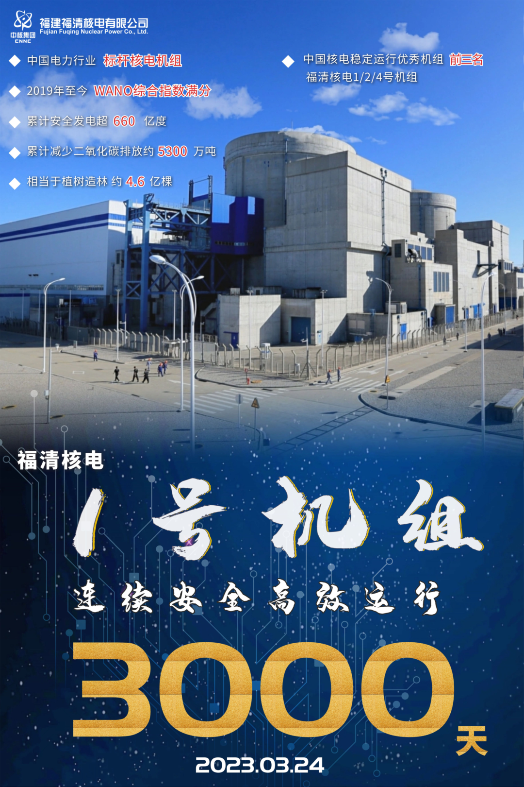 2023年3月24日,“中国电力行业标杆核电机组”——中核集团旗下中国核电投资控股的福清核电1号机组实现连续安全高效运行3000天,稳定运行时长位列中核集团运行核电机组第一名,创造世界同类型机组一流运行业绩!