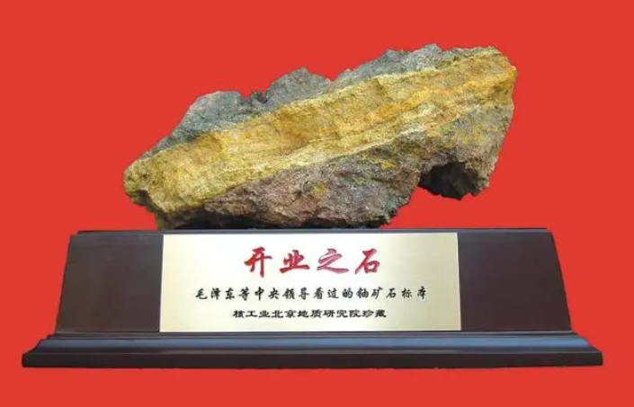 在核电科技馆的一个展台上,摆放着新中国第一块铀矿石模型,被称为核工业的“开业之石”。1954年7月在我国广西富钟县采集到的第一块铀矿石,1955年1月被地质部部长李四光带到中南海,在中央书记处扩大会议上揭开了它的神秘面纱,当天,毛泽东就在会议上作出了建立和发展我国原子能事业的战略决策。铀矿石在被找到后不久,两次被带进中南海,成为中央领导反复谈论、提供决策的开业之石,也是从那个时候起,中国人开始了核工业创业的起步阶段。